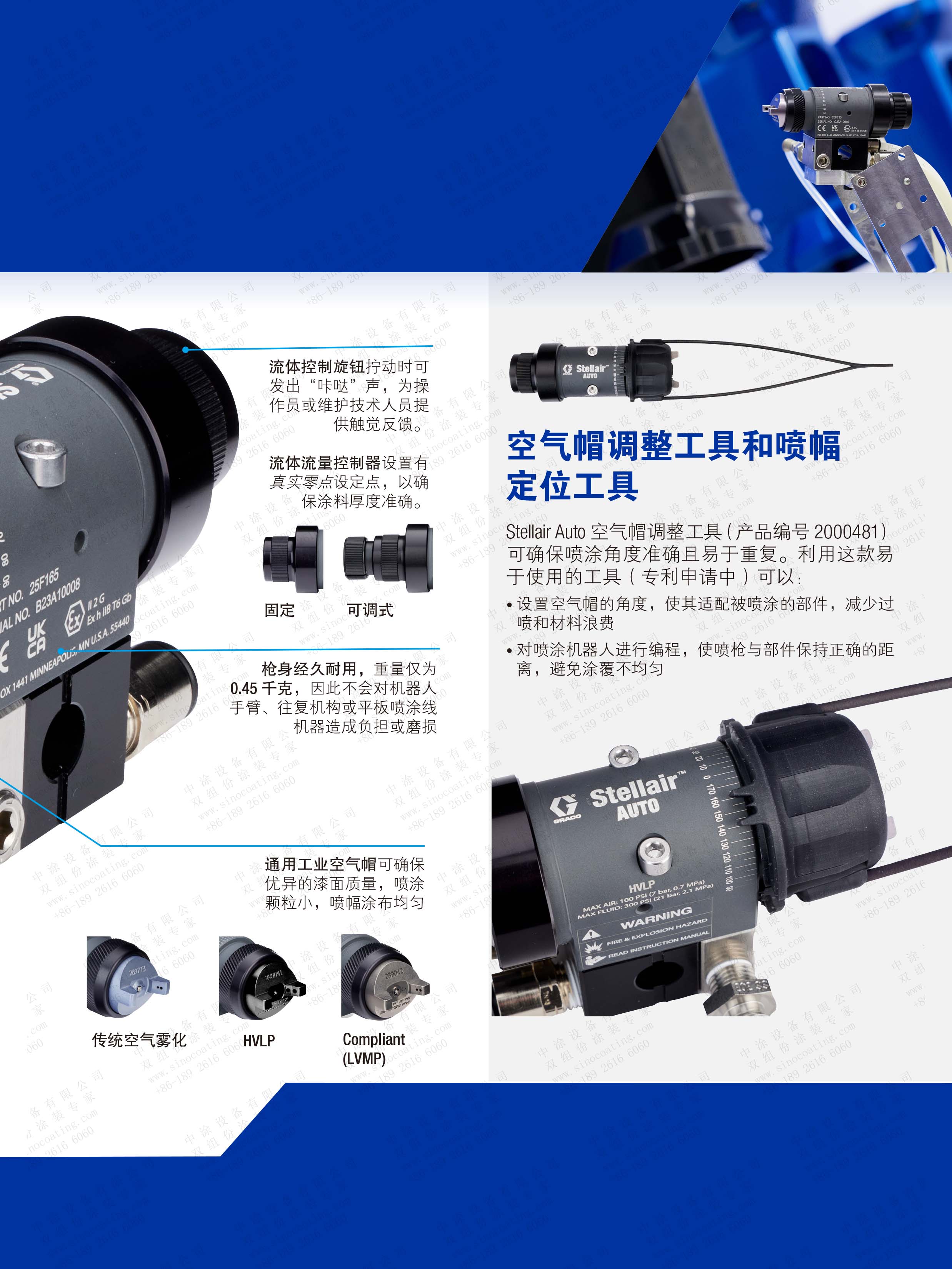 行业领先的性能、精度、易维护性和使用寿命• 行业领先的喷涂性能,材料专用的空气帽功不可没• 喷涂精度高且便于重复,得益于创新的空气帽调整工具和喷幅定位工具• 可快速维护,仅需一分钟左右即可更换流体总成组件,几乎避免了与维护相关的停机时间• 最大程度节省材料,归功于直通式流体通道设计,使用少量溶剂即可冲洗干净• 自动化设备寿命长,紧凑和轻量的枪身设计减少喷涂机器人机械臂、往复机构或平板喷涂设备的负载和磨损